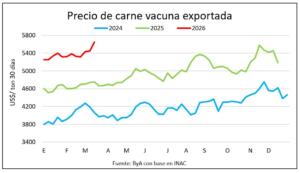 La tonelada de carne vacuna exportada en los últimos 30 días móviles alcanzó un precio de US$ 5.648 por tonelada, un máximo desde que hay registros, de acuerdo a los datos preliminares de INAC. Superó los US$ 5.579 alcanzados en noviembre de 2025. En la última semana el valor promedio … Sigue leyendo Récord absoluto en el precio de exportación para carne vacuna