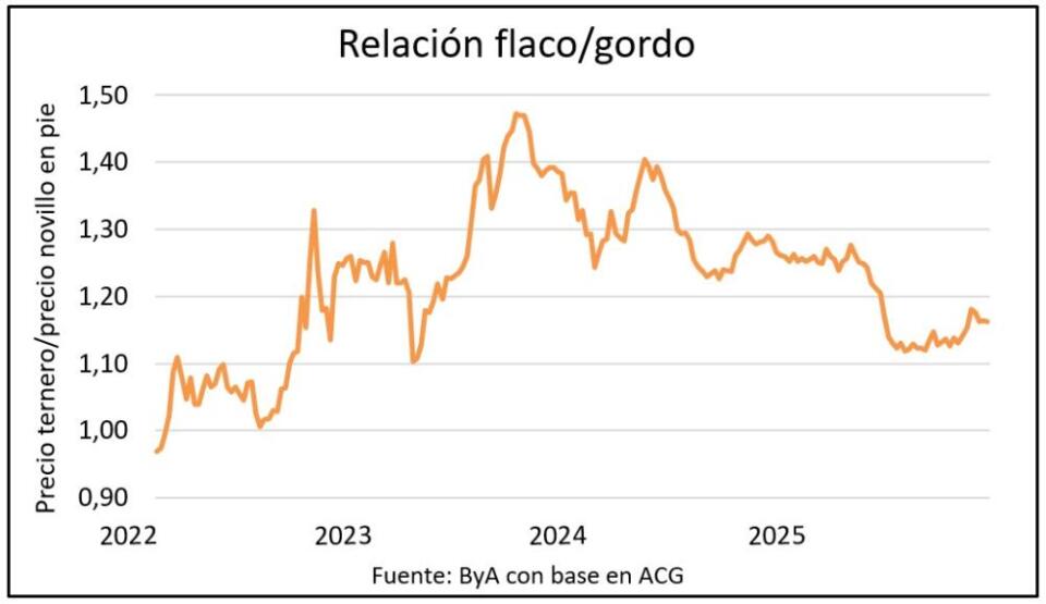 La relación de precios entre ternero y novillo bajó en la última semana y en un mes se redujo de 1,18 a 1,16, favoreciendo a los invernadores que pueden vender ganado gordo y reponer con una inversión algo menor.