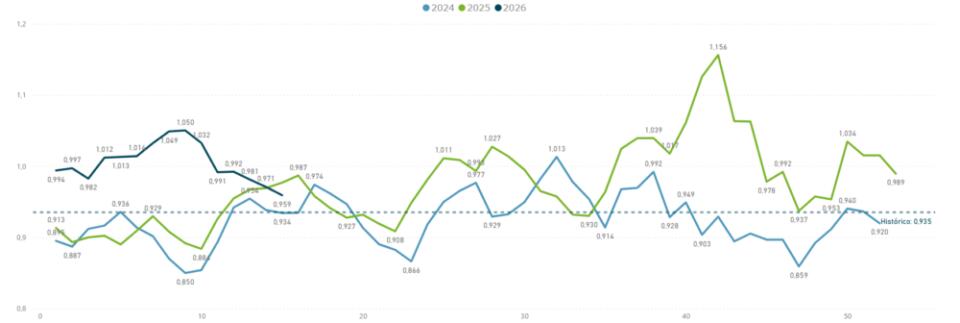 En la vaca la Relación Hacienda Exportación bajó a 0,855 frente al 0,912 de igual fecha del año pasado, todavía por encima del promedio histórico de 0,847. Se trata del menor nivel desde mayo de 2025.
