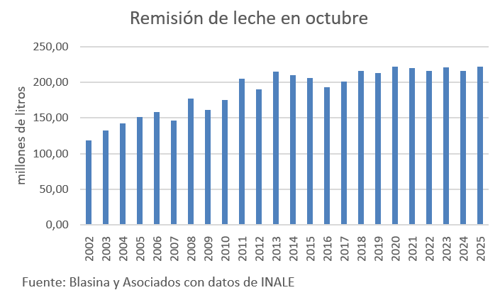La remisión de leche en octubre alcanzó los 221,85 millones de litros, 3% arriba del año anterior y el mejor octubre desde 2020. Se trata del segundo mayor registro para ese mes desde 2002, de acuerdo a los datos preliminares publicados por INALE.