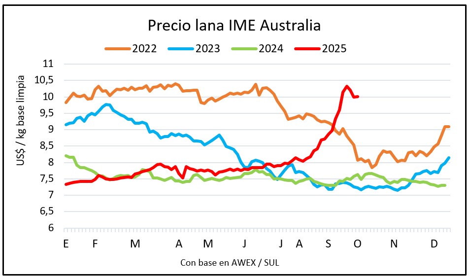 El indicador australiano se mantuvo por encima de US$ 10 por kilo base limpia y se instaló en un nivel de valores 30% superiores a los de hace 12 meses: US$ 10,01 por kilo base limpia y en dólares australianos AU 15,17.