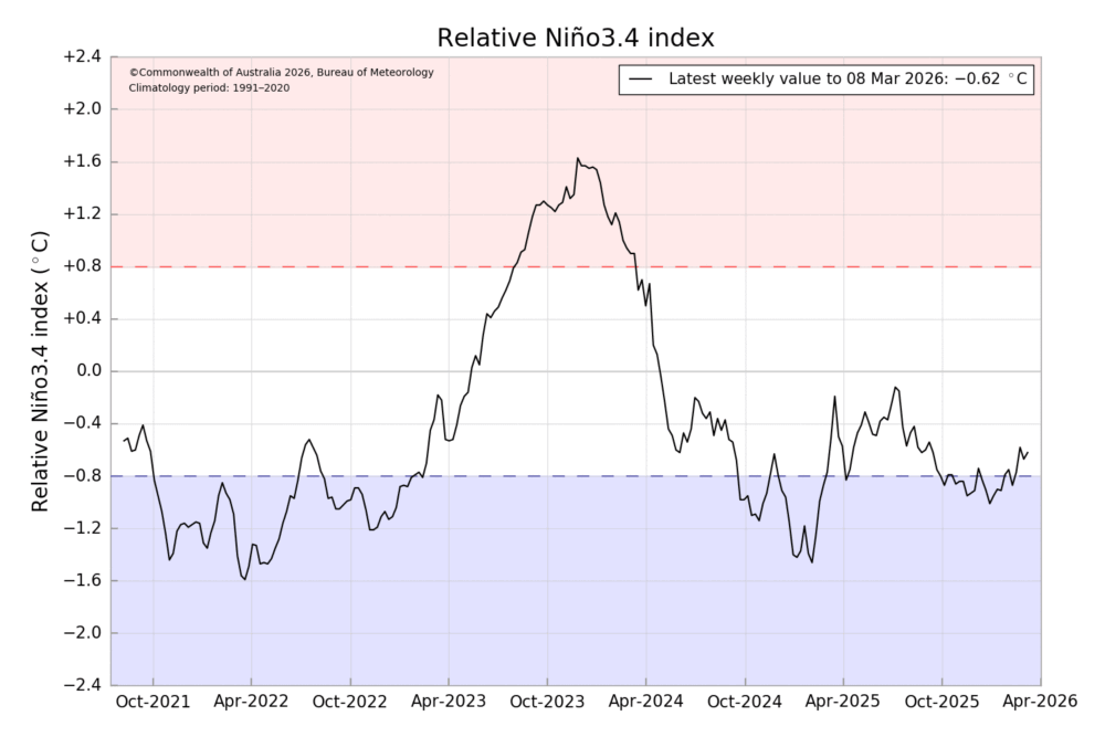 Las lluvias de la próxima primavera prometen ser mejores. La temperatura tal como está previsto, empieza a subir en el Océano Pacífico. La Niña se va y el Niño parece confirmarse para la próxima primavera.