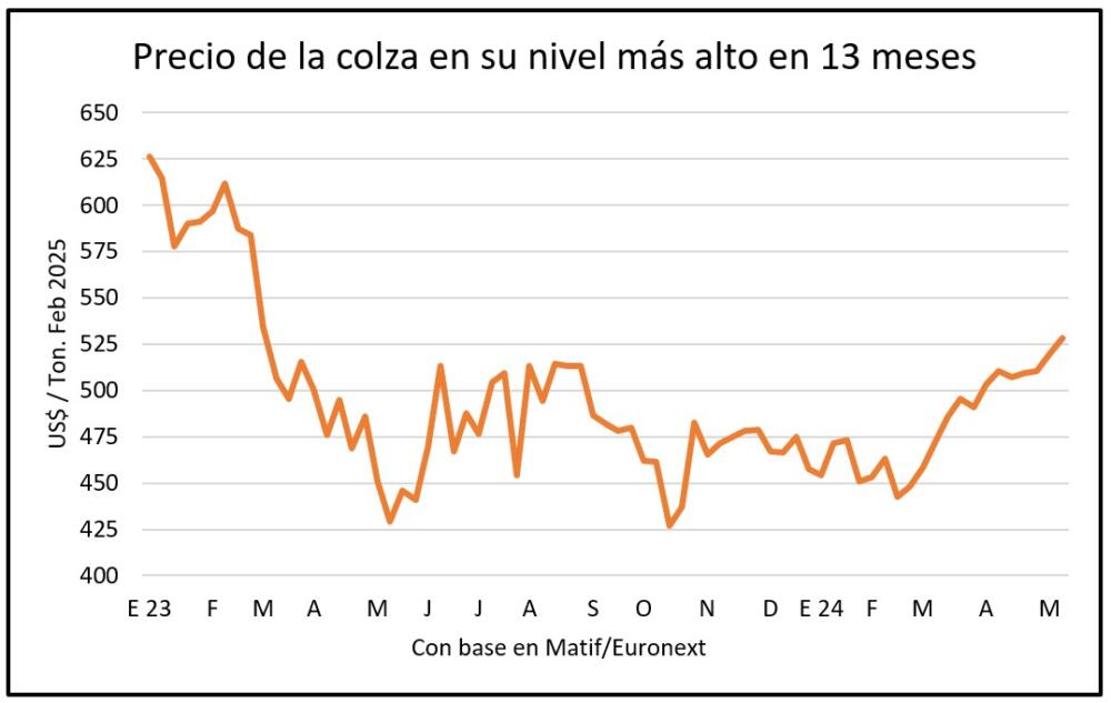 También pasaron a ser muy buenos los valores para fijar colza –otro cultivo que no está sembrado y que tiene la ventana más acotada para cumplir las fechas ideales- con un salto de casi US$ 12 en el mercado de París hasta US$ 528,5 por tonelada este lunes.