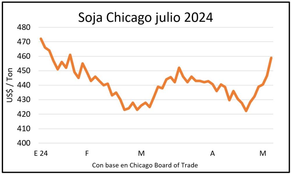 En Chicago la posición julio para la oleaginosa subió US$ 31 en las últimas cuatro ruedas de la Bolsa de granos, un incremento de 7,3% que llevó a US$ 458,84 el valor de la tonelada este lunes.