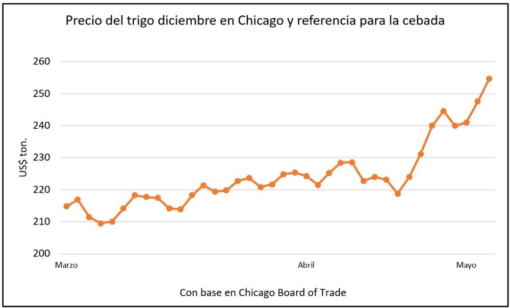 Por otra parte el trigo en Chicago y en Europa volvió a dar un salto y acumula un incremento de US$ 45 por tonelada en menos de dos meses, una suba de más de 20% en pocas semanas que sigue mejorando las perspectivas para el trigo de la próxima cosecha en Uruguay y de la cebada, que todavía no fueron sembradas.