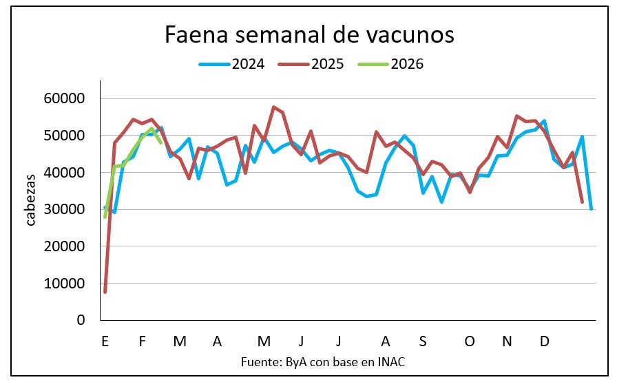 La faena vacuna se redujo en un 7,5% en el periodo del 8 al 14 de febrero, desde 51.957 a 48.029 cabezas. Fue la 14ª semana seguida con una proporción mayor de vientres que de novillos: 50,4% frente a 48,2%.