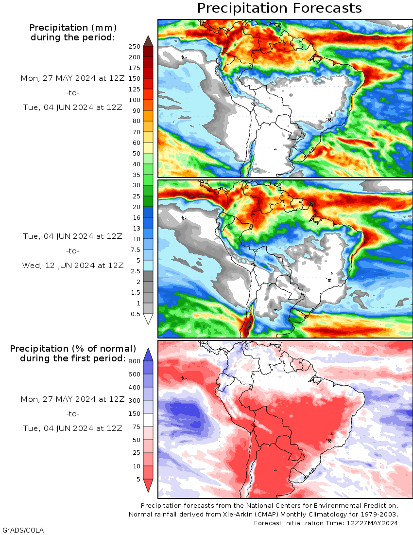 Las lluvias continúan y aunque lo peor parece haber pasado para Uruguay y Río Grande del Sur, justamente en las zonas fronterizas como Cerro Largo y Rivera, y en toda la zona cercana a la Laguna Merín, las lluvias parecen persistir hasta entrado junio. En principio tras las lluvias de este lunes y martes recién volvería lloviznas el próximo domingo, en forma leve. Sin embargo los mapas muestran que las lluvias volverían.