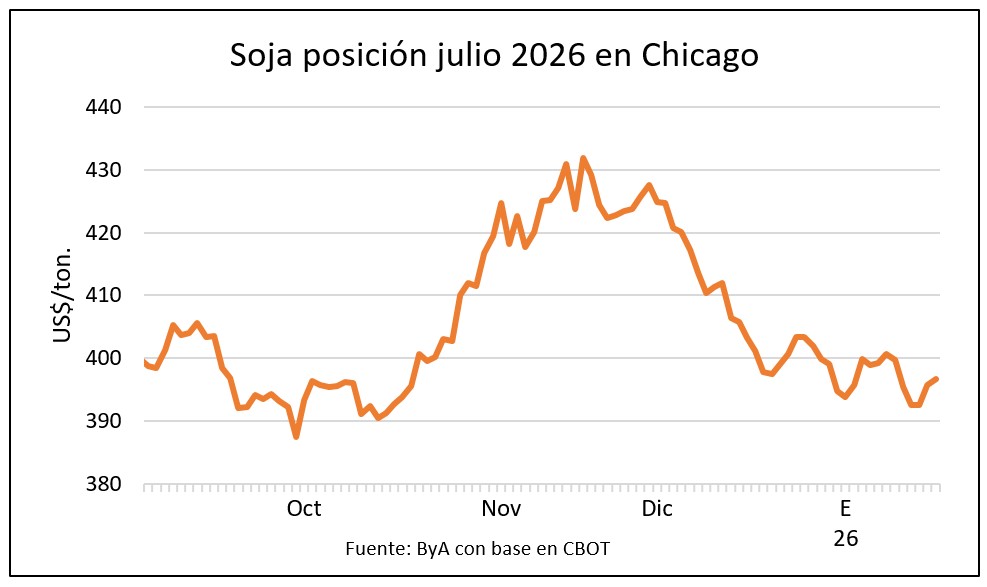La soja posición julio 26 cerró la semana en US$ 396,6 y referencias locales sobre US$ 362 /ton luego de tres jornadas de suba aunque por debajo del valor de US$ 399 que traía antes del informe oferta y demanda del USDA del lunes 12 que confirmó una sobreoferta de granos en el mundo y particularmente en la región sudamericana.