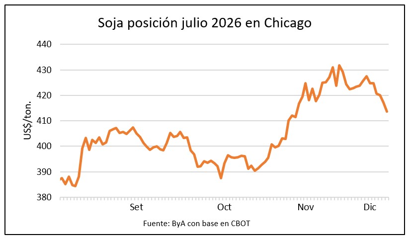 Nuevos reportes de ventas de soja estadounidense a China este lunes no lograron cambiar la senda bajista de la oleaginosa que perdió más de tres dólares en el mercado de Chicago y cerró a US$ 413,6 en la posición julio 2026, de referencia para Uruguay. Perdió más de US$ 18 por tonelada en las últimas tres semanas.