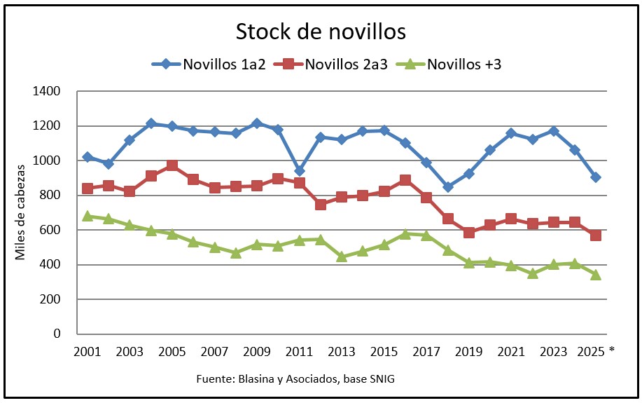 El stock vacuno creció 1,2% en el último año respecto a 2024 al comparar los datos preliminares de las declaraciones juradas de existencias ganaderas de los dos años, Subió desde 11,32 a 11,45 millones de cabezas. Los terneros, como adelantamos la semana pasada, marcaron un nuevo récord con 3,039 millones de cabezas aunque con una cifra inferior a la esperada.