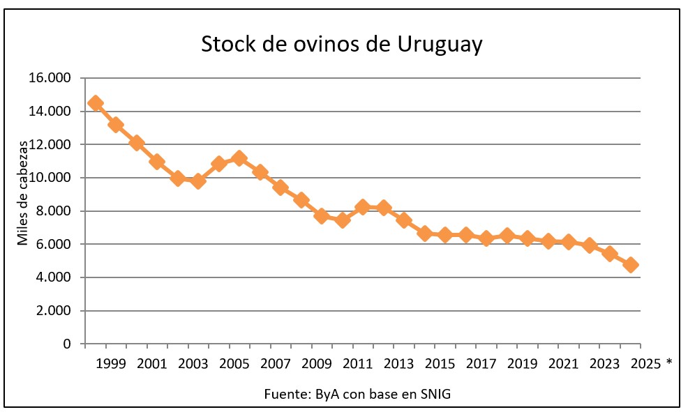 Entre los ovinos el panorama es mucho más preocupante de lo que se estimaba en la previa con una reducción de la majada de 5,42 a 4,75 millones de cabezas entre 2024 y 2025, una caída de 14,1% que la retención de ovejas este año no ha podido frenar, aunque los envíos a faena hayan caído 37% en lo que va de 2025.