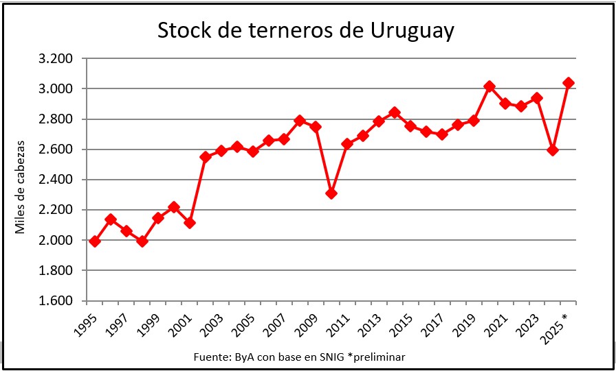 El mayor aumento se da entre los terneros con unas 450 mil cabezas más, un incremento de 17,2% respecto a 2024 y por encima del máximo de 3,015 millones de hace cinco años.