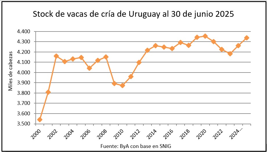 En vacas se registra un aumento de 2,7% con unos 130 mil animales más que hace un año, con un incremento mayor entre las vacas de invernada (+12,7%) que entre las vacas de cría (+1,8%). Con 4,338 millones de cabezas el número de vacas de cría crece por segundo año y vuelve al rango de los máximos registrados en 2019 y 2020.