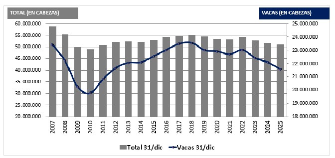 Tras el tercer año seguido de caída, el stock total quedó en 50.920.790 vacunos, 3,3 millones de animales menos que hace tres años.