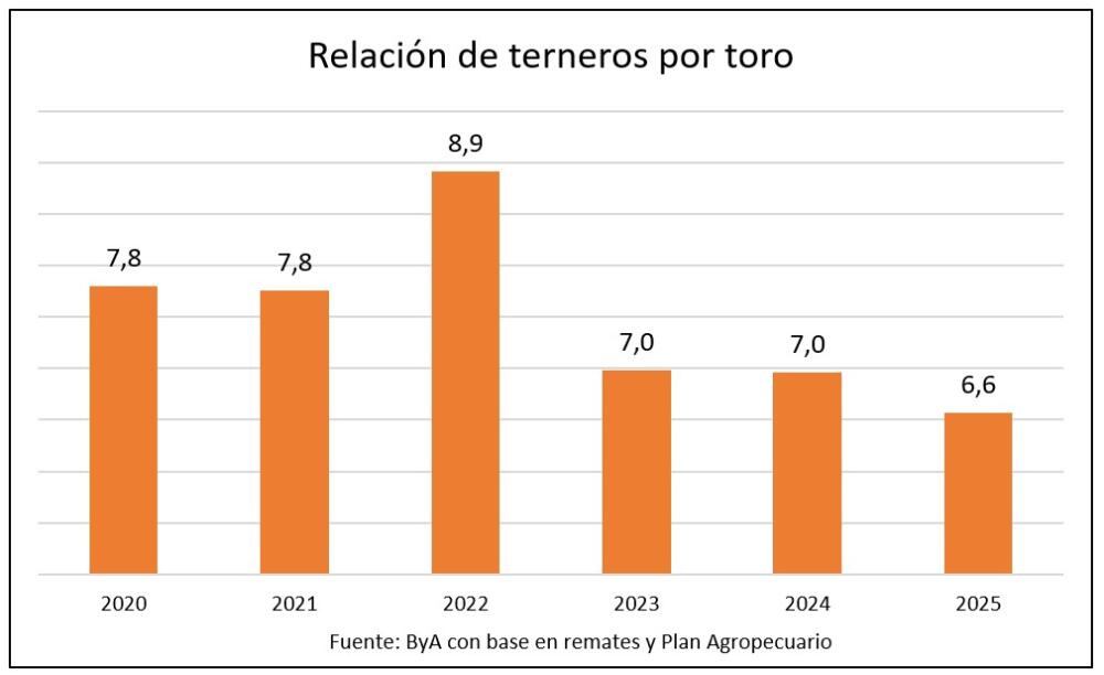 Esa relación era de 7 terneros en 2023 y 2024, más accesibles que en 2022 cuando la medida era de 9 terneros por toro, viniendo de casi 8 en 2020 y 2021.