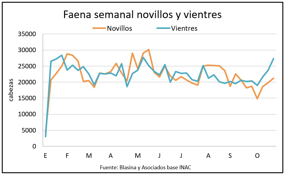 La faena vacuna aumentó 12% en la semana y emparejó a octubre del año pasado con un acumulado mensual de 155.152 cabezas solo 1% detrás del año anterior.