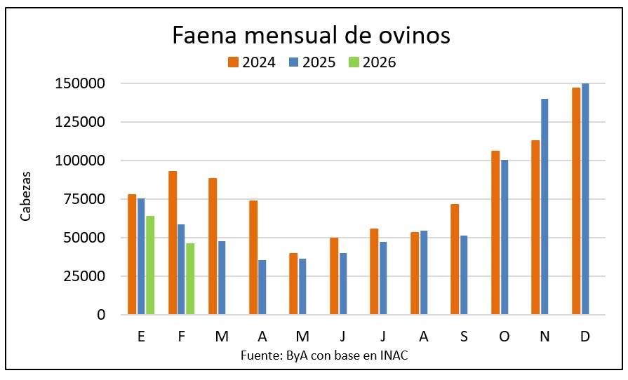 En febrero la faena de ovinos fue la más baja en ocho meses con 45.954 cabezas según los datos de INAC de este lunes, 21% inferior a la del mismo mes del año anterior y menos de la mitad que en febrero de 2024.
