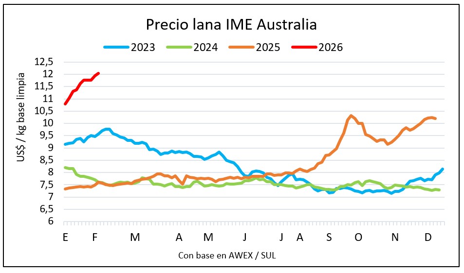 La semana anterior el indicador IME había cerrado en US$ 12,05 por kilo base limpia, superando los US$ 12 por primera vez desde junio de 2019 y valores entre 45% superiores a los del final de la zafra 2024/25 para las lanas más finas y 65% para las lanas cruza y Corriedale de 28 micras.
